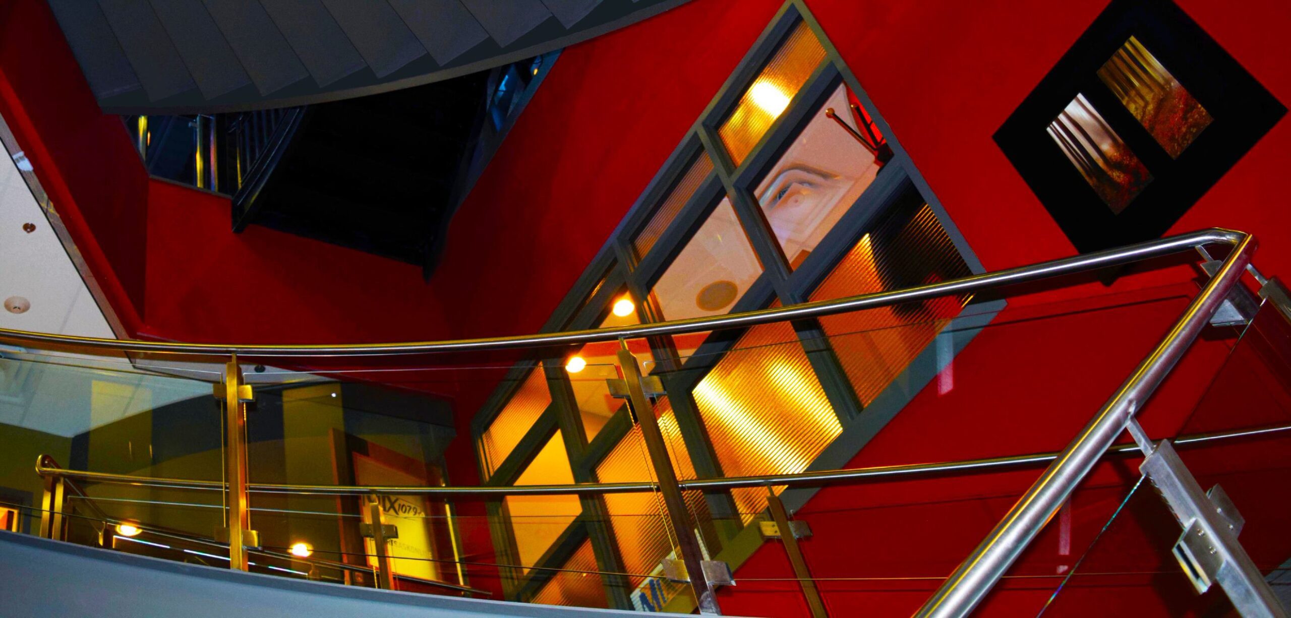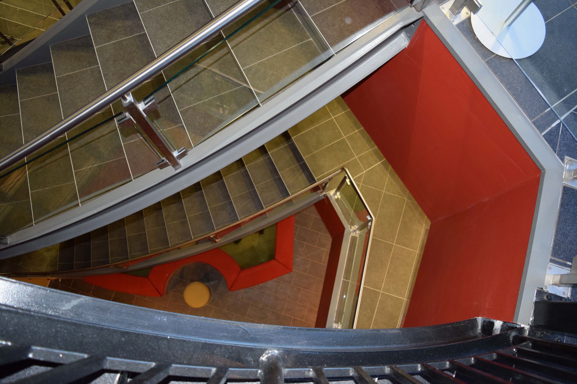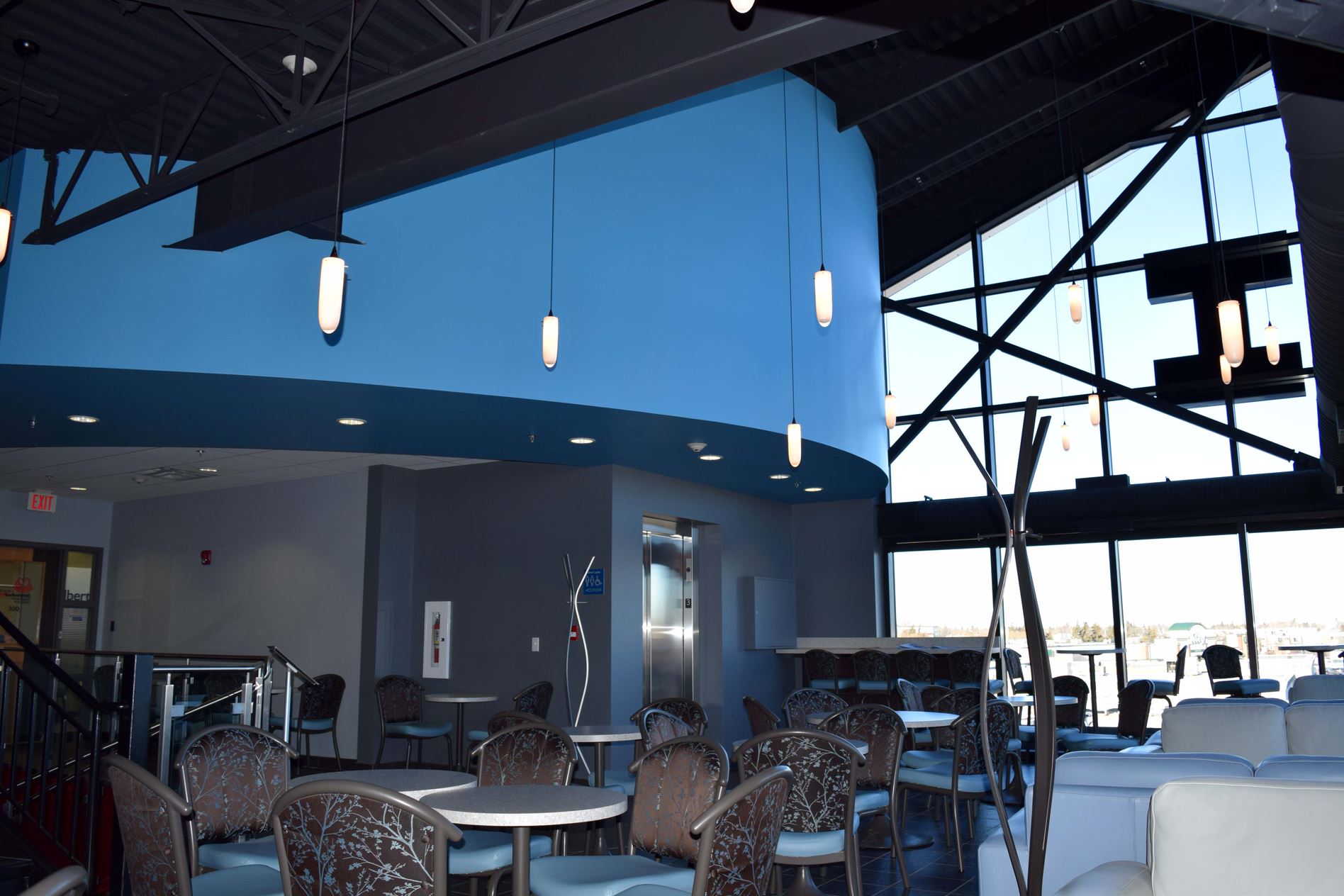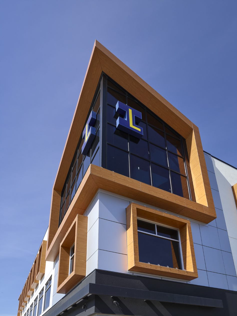 A focal point in the architectural design of the building, the third storey houses a bistro-style cafeteria and additional office spaces. The building also boasts a rooftop patio, complete with a walking path and seating areas for staff.