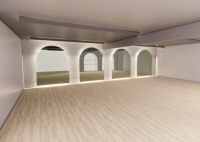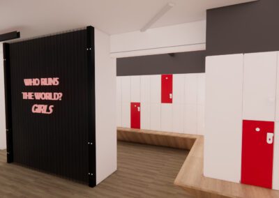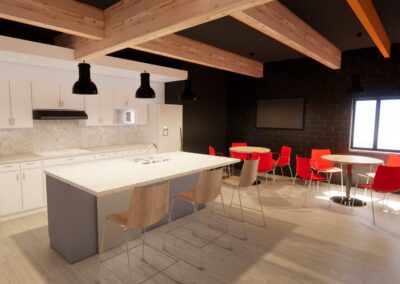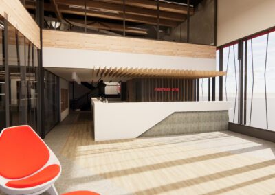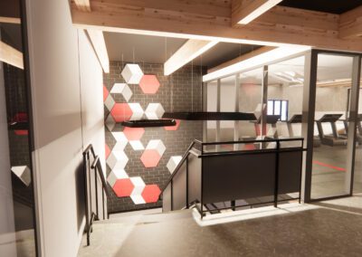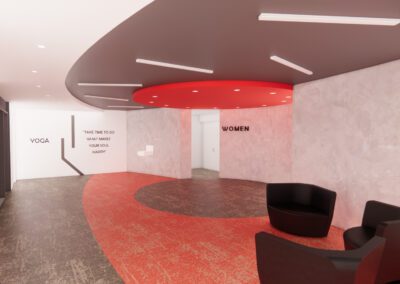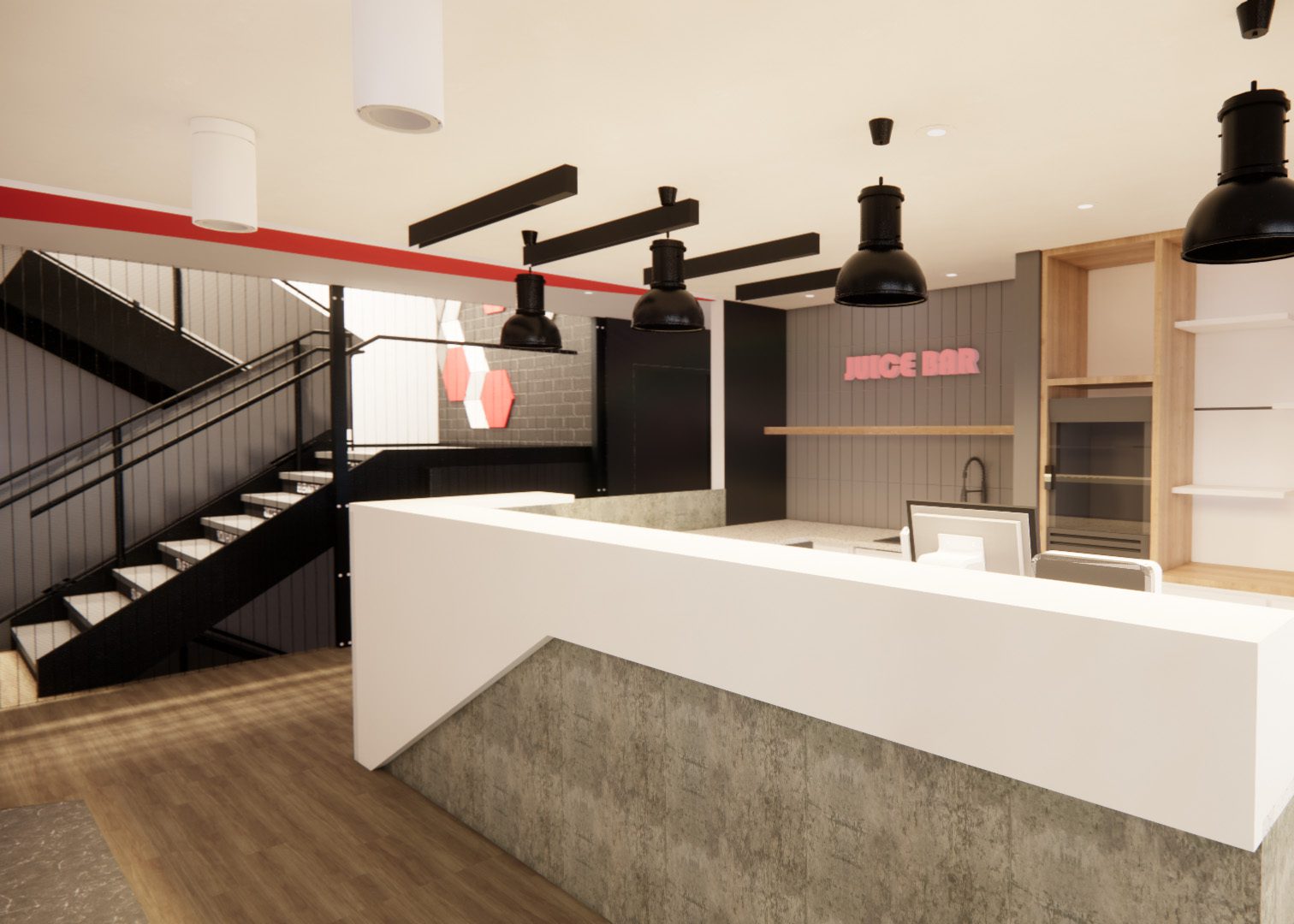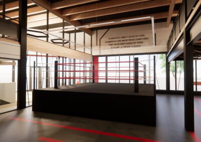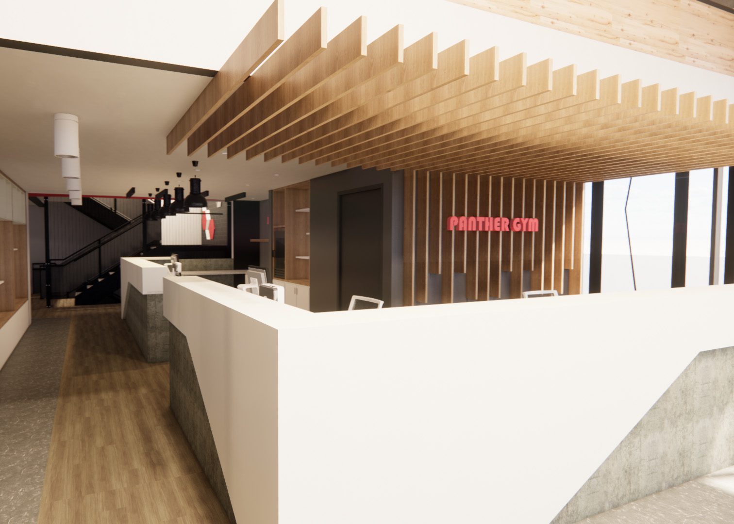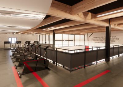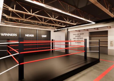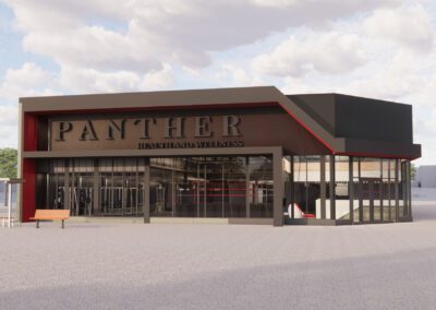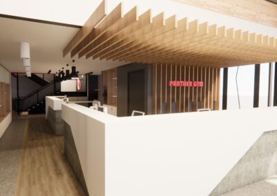 The design of the new Panther Health and Wellness Centre is programmatically distinct in that it combines sport, recreation, health, wellness, and commerce under one roof. On the main floor of the 15,683 ft² building, patrons are welcomed into a contemporary gym space with two boxing rings, a dedicated fitness area, complete with a juice bar, multi-purpose flex space, an office and staff lounge. From the main floor to the basement, there is a noticeable shift in energy from the buzz of the gym area to the hum of the yoga studio, steam room, private and public locker rooms. The second floor is dedicated to several health and wellness amenities, which include a reception area and spa, as well as rooms for massage therapy, acupuncture, and chiropractic care. The second-floor mezzanine, which provides a clear view of the main boxing ring, incorporates another fitness area with a designated space for performance training service for athletes, fitness enthusiasts, and individuals of all ages and ability levels. Offices spaces, a staff break room and coffee station round off the spaces of the second floor.